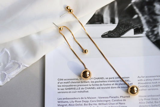Statement Gold Ball Drop Earrings, Gold Dangle Drop Earrings, Gold Party Statement Earrings, Statement jewellery, Long Chain Drop Earrings