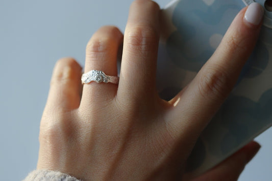 Regular price £25.00 GBPRegular priceUnit price / perSale price £25.00 GBPSilver Textured Ring with Bezel-Set Diamond