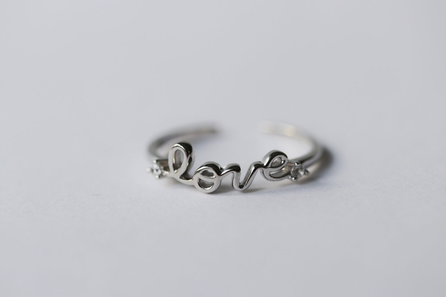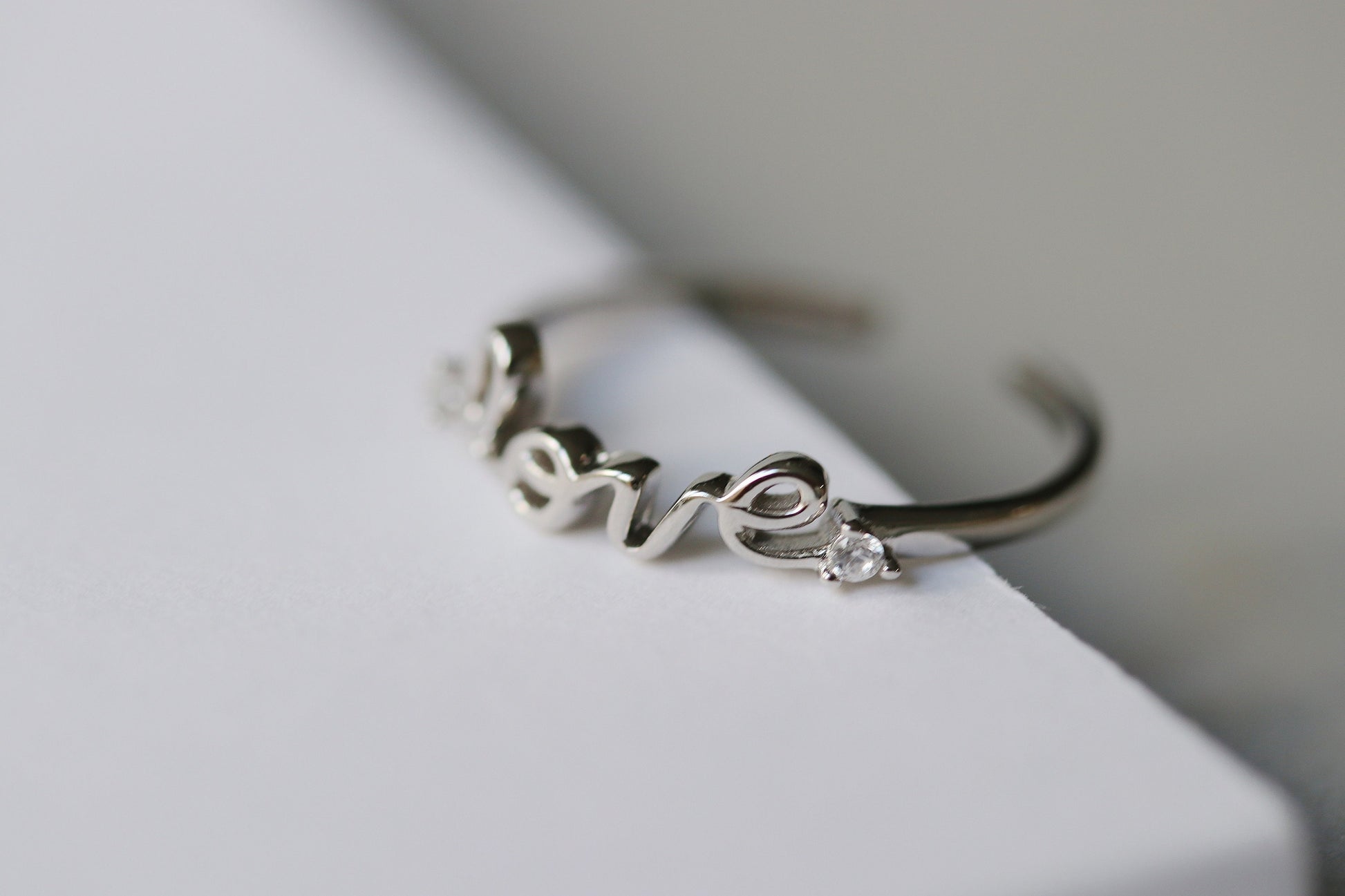 Show your love for minimalist style with our Sterling Silver Love Script Ring. This dainty, open-band ring features the word "Love" elegantly scripted, adding a touch of sentiment to any outfit. Crafted from high-quality sterling silver, it offers a polished finish that’s both durable and stylish. Lightweight and comfortable, this ring is perfect for everyday wear or as a meaningful gift. Embrace simplicity with this charming love ring, ideal for stacking or wearing solo.