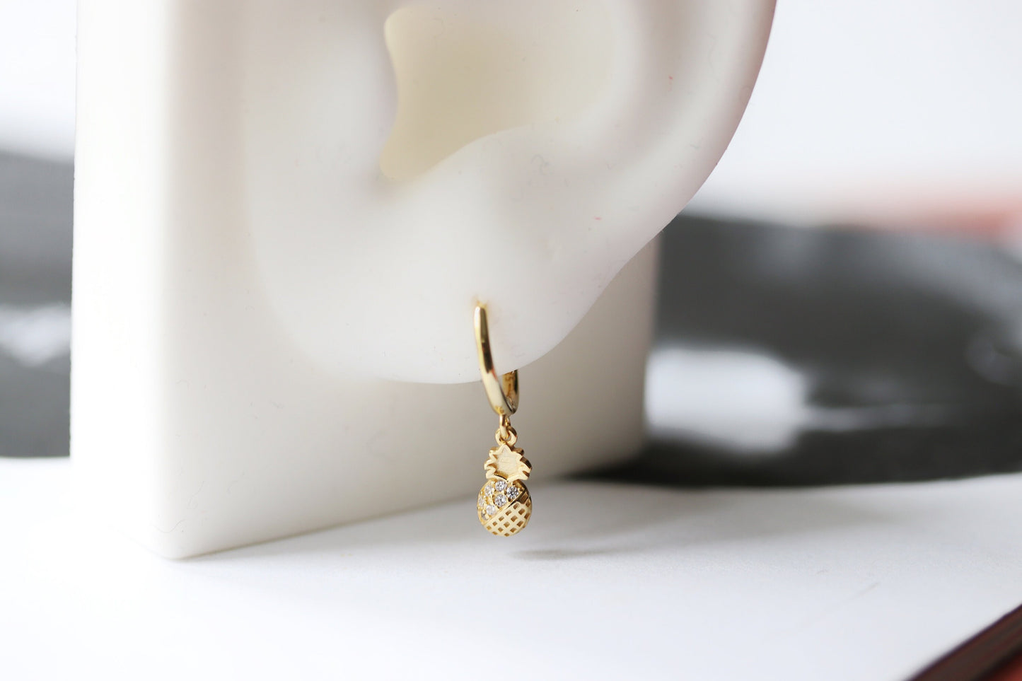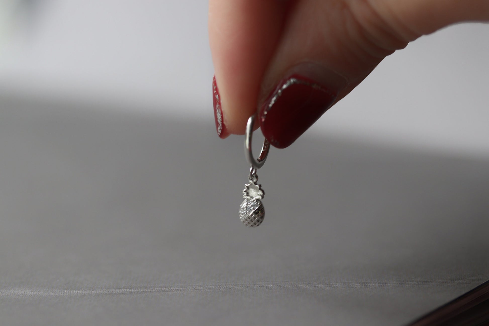 Add a playful tropical touch to your style with our Gold Vermeil/Sterling Silver Pineapple Dangle Hoop Earrings. These fun and elegant hoops feature charming pineapple-shaped dangles, adorned with sparkling cubic zirconia crystals for a hint of glamour. Crafted from premium gold vermeil or sterling silver, these earrings offer a luxurious, polished finish with lasting durability. The lightweight design ensures comfortable wear, making them perfect for both casual outings and special occasions. Bring a fresh, vibrant vibe to your jewellery collection with these delightful pineapple dangle hoop earrings, effortlessly blending playful charm with sophisticated sparkle!